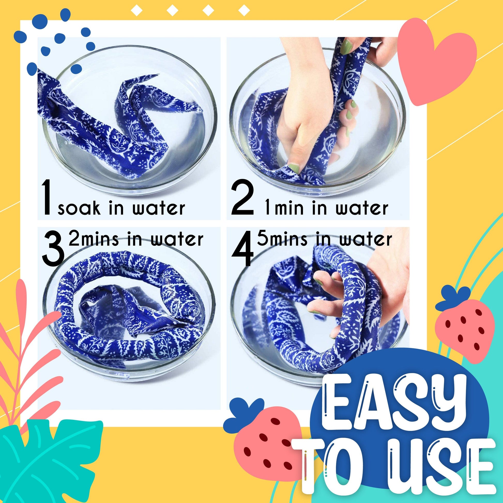 Simply activate the cooling technology by soaking the cooling scarf in the water for about 3 - 5 minutes until the crystals fully absorb the water, then gently remove any excess water. Wrap it around your neck, head, wrist, etc. You can even keep it in the freezer for a cooler effect during those hot weathers.