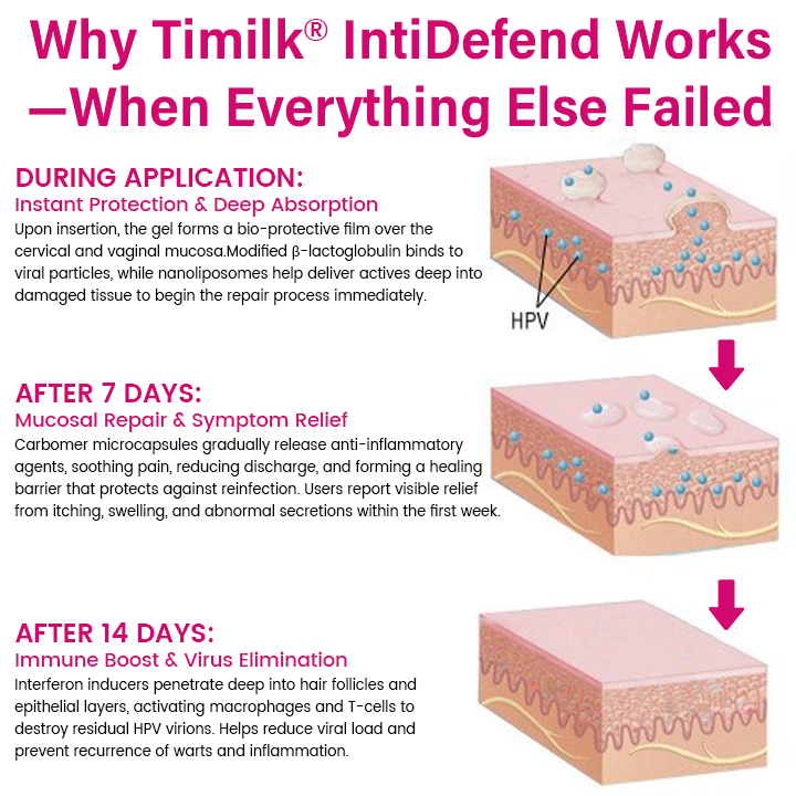 Unlike harsh treatments that only bring short-term relief, Timilk® IntiDefend works at the root—blocking HPV, repairing damage, and restoring lasting intimate health.